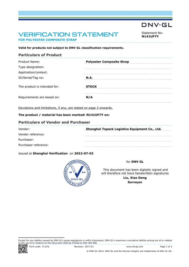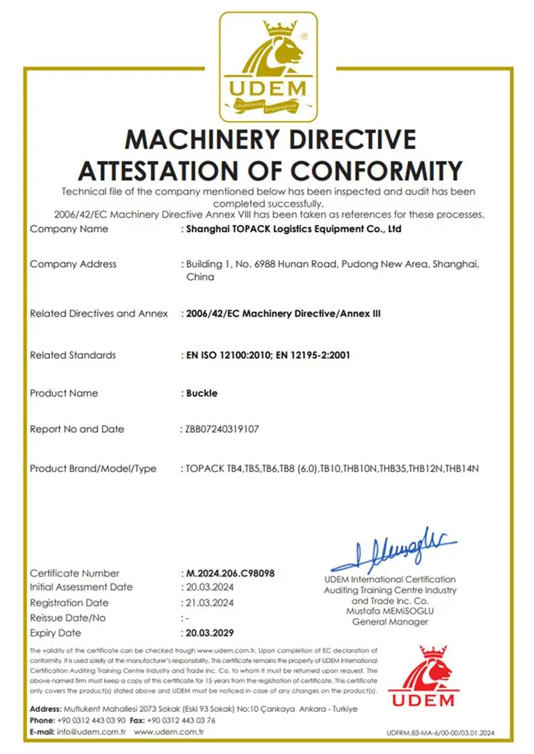 Provides CE and conformity assessments, ensuring our packaging straps, buckles, and strapping machines meet EU directives and global compliance.