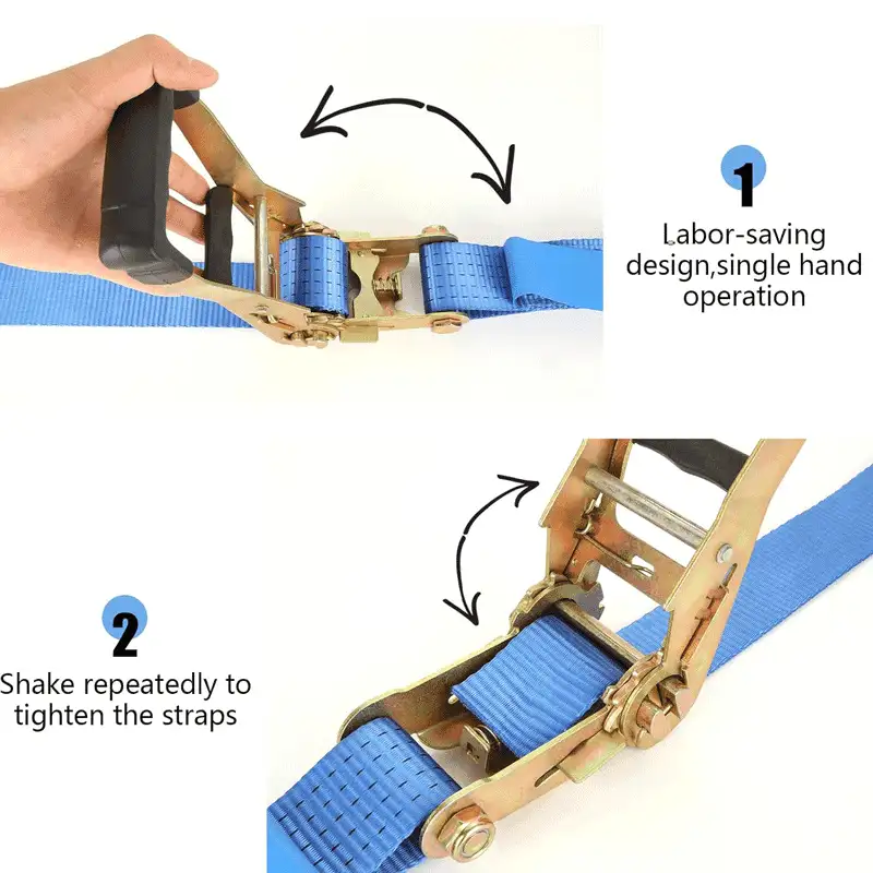 European standard 2″ (50mm) ratchet straps, 5 ton capacity, 6-12m adjustable length. Plastic handle, custom color/logo, heavy duty polyester cargo tie down belts.
